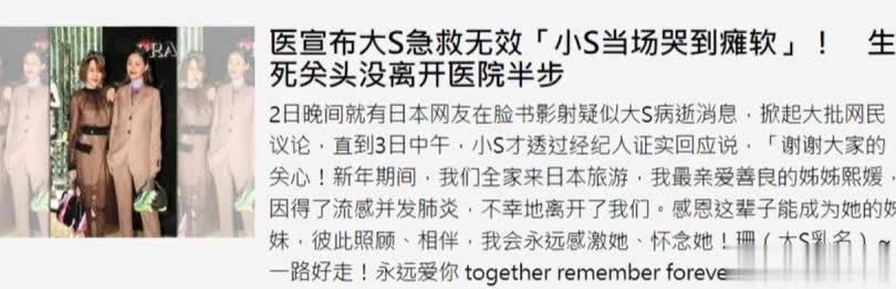 据日媒透露,大S猝死离世,妹妹小S寸步不离守护在姐姐身边。